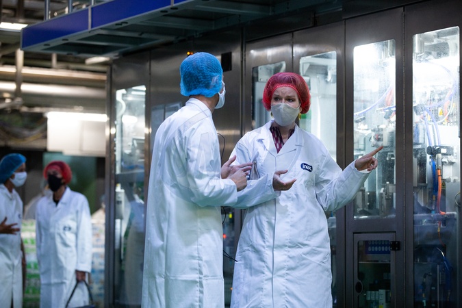 Krolowa Matylda w czepku i w fartuchu podczas wizyty w firmie mleczarskiej
