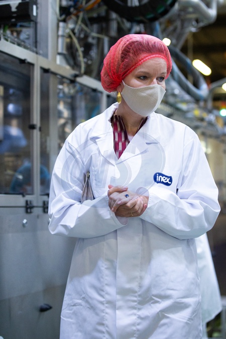 Krolowa Matylda w czepku i w fartuchu podczas wizyty w firmie mleczarskiej
