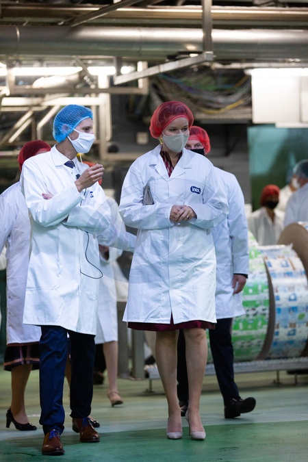Krolowa Matylda w czepku i w fartuchu podczas wizyty w firmie mleczarskiej