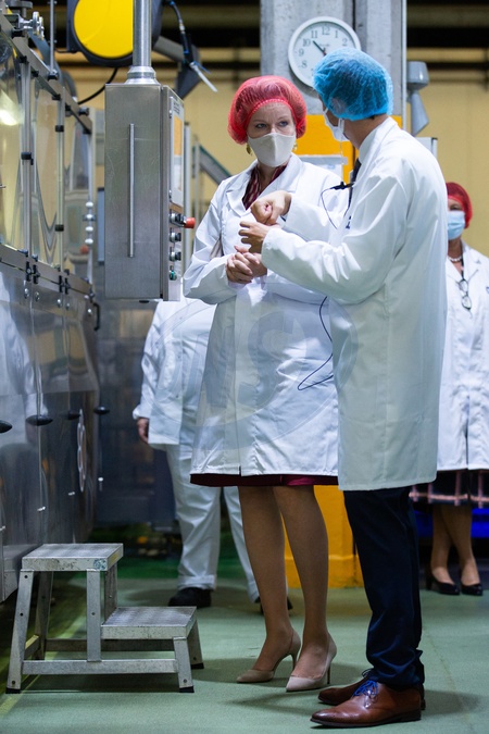 Krolowa Matylda w czepku i w fartuchu podczas wizyty w firmie mleczarskiej