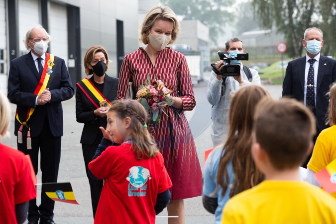 Krolowa Matylda w czepku i w fartuchu podczas wizyty w firmie mleczarskiej