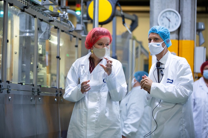 Krolowa Matylda w czepku i w fartuchu podczas wizyty w firmie mleczarskiej