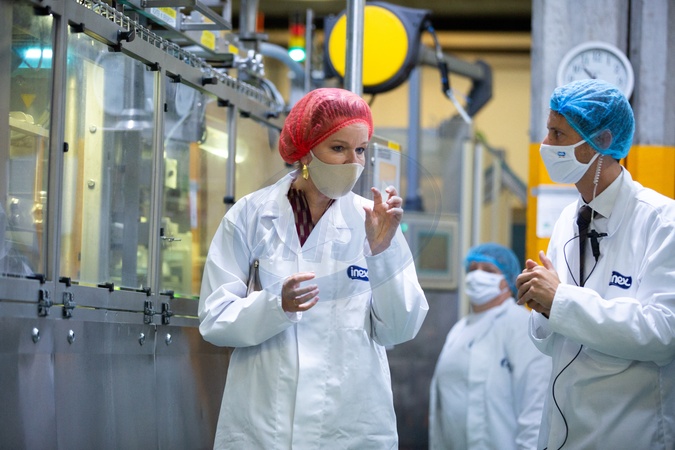 Krolowa Matylda w czepku i w fartuchu podczas wizyty w firmie mleczarskiej