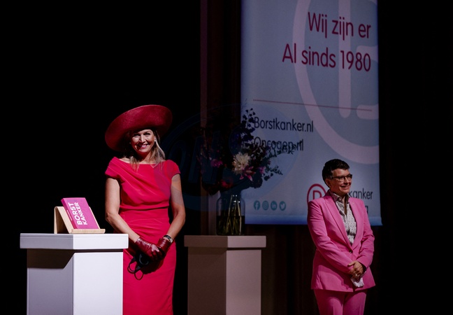 Krolowa Maxima w czerwieni podczas inauguracji miesiaca raka piersi na Swiatowym Forum w Hadze
