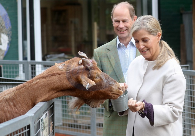 Ksiaze Edward i hrabina Sophie karmia lamy i kroliki na farmie