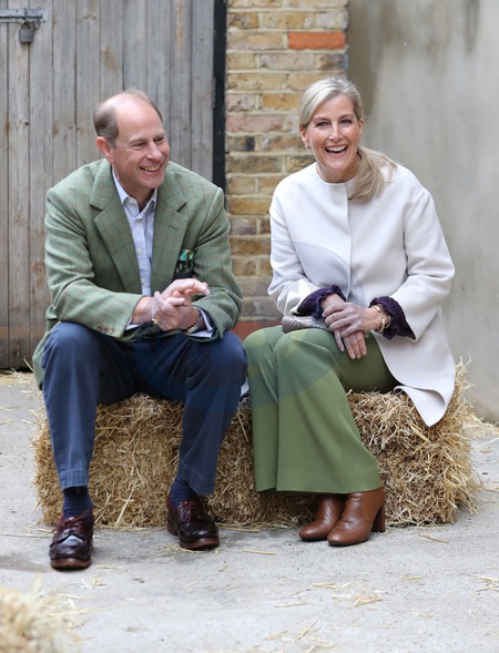 Ksiaze Edward i hrabina Sophie karmia lamy i kroliki na farmie
