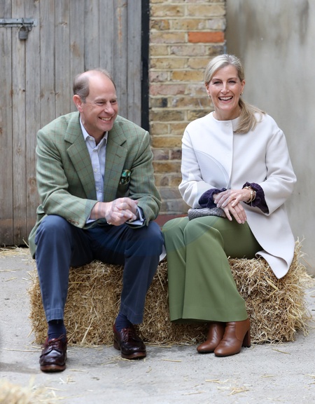 Ksiaze Edward i hrabina Sophie karmia lamy i kroliki na farmie