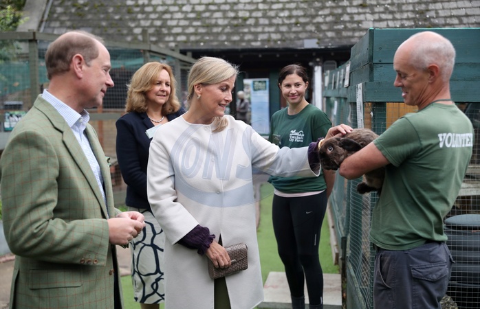 Ksiaze Edward i hrabina Sophie karmia lamy i kroliki na farmie