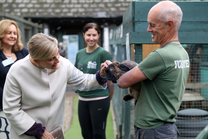Ksiaze Edward i hrabina Sophie karmia lamy i kroliki na farmie