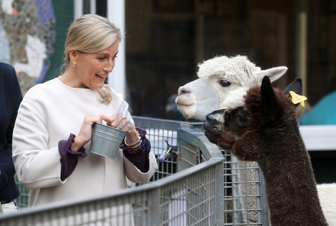 Ksiaze Edward i hrabina Sophie karmia lamy i kroliki na farmie