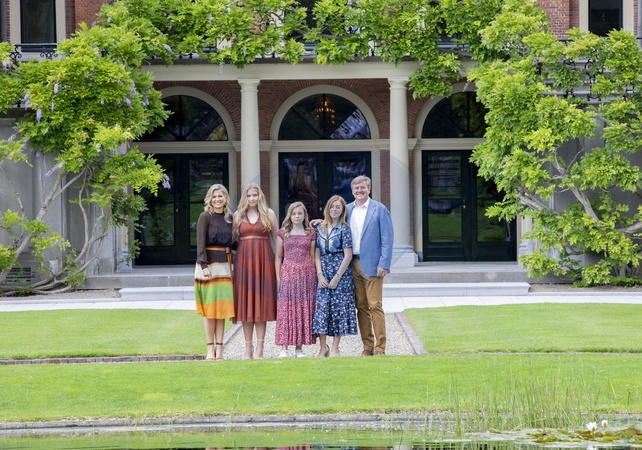 Rodzinna sesja - Willem Alexander z zona i corkami pozuje w ogrodzie palacu Huis ten Bosch