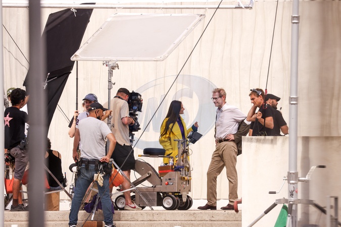 no web - Demi Moore w zoltym plaszczu na planie The Substance