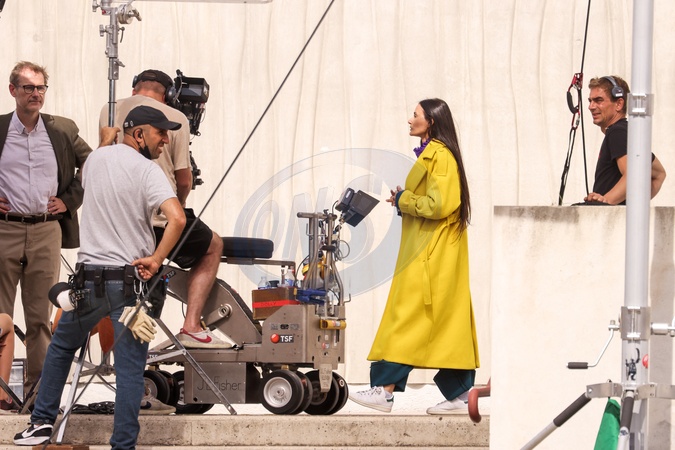no web - Demi Moore w zoltym plaszczu na planie The Substance