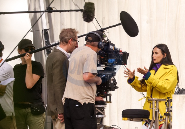 no web - Demi Moore w zoltym plaszczu na planie The Substance
