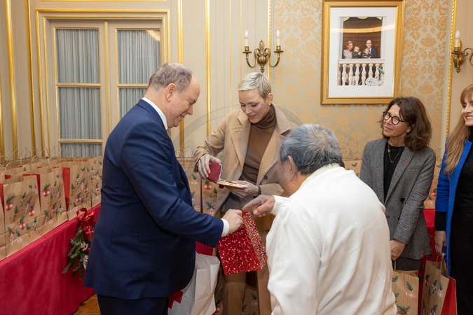 Ksiezna Charlene delikatnie usmiecha sie podczas rozdawania prezentow w Czerwonym Krzyzu