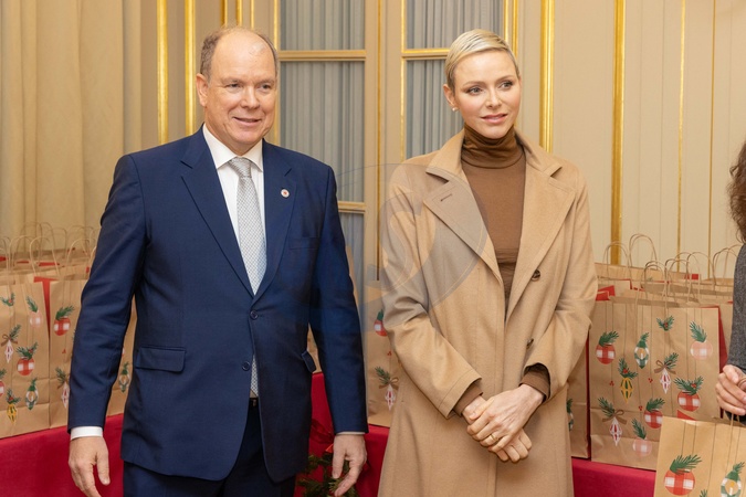 Ksiezna Charlene delikatnie usmiecha sie podczas rozdawania prezentow w Czerwonym Krzyzu