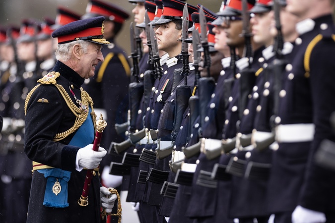 Karol III przeprowadza inspekcję parady władcy w Royal Military Academy Sandhurst_