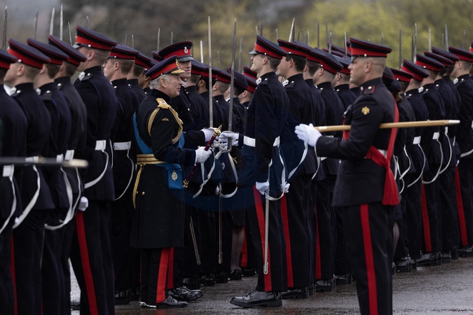 Karol III przeprowadza inspekcję parady władcy w Royal Military Academy Sandhurst_
