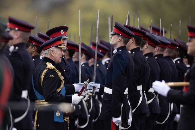 Karol III przeprowadza inspekcję parady władcy w Royal Military Academy Sandhurst_