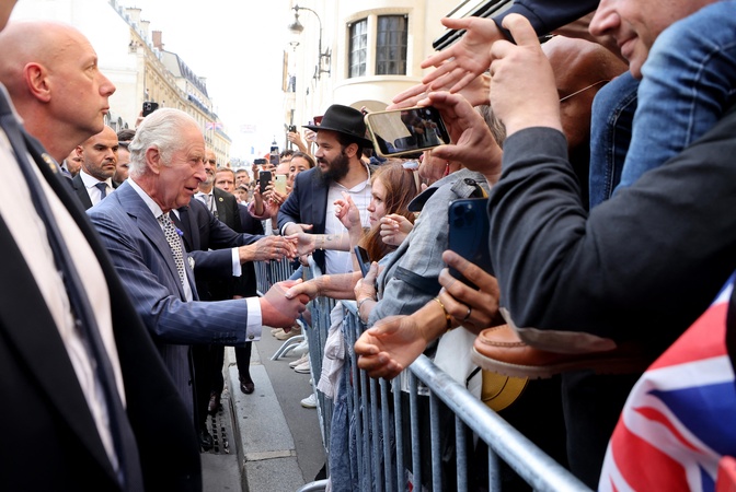 Macron Krol Karol III przed ambasada WB w Paryzu