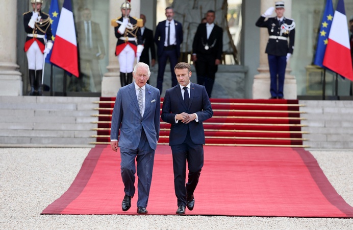 Macron Krol Karol III przed ambasada WB w Paryzu