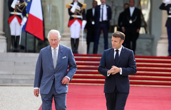 Macron Krol Karol III przed ambasada WB w Paryzu