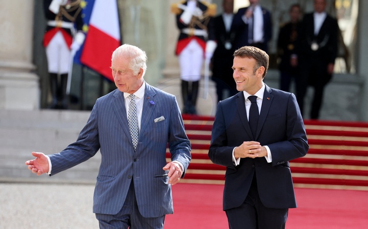 Macron Krol Karol III przed ambasada WB w Paryzu