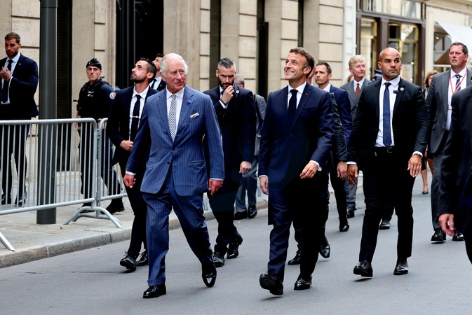 Macron Krol Karol III przed ambasada WB w Paryzu