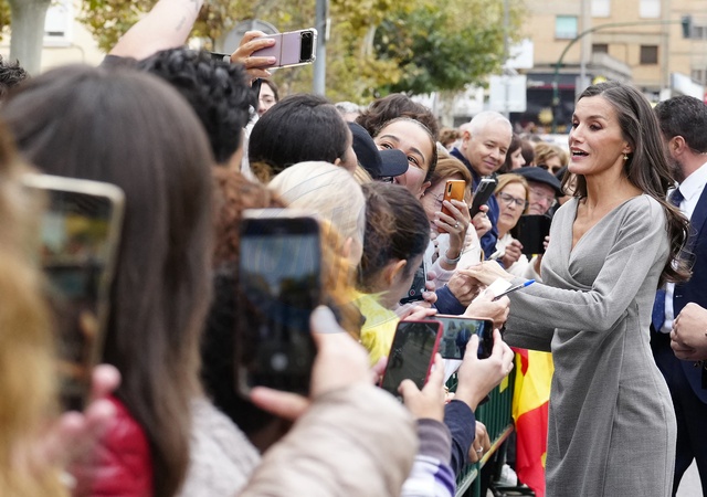 Bain de foule pour la reine Letizia d'Espagne avant de participer à la 23ème édition du Festival du Film Opera Prima au cinéma Moncayo à Tudela, le 3 novembre 2023. Au cours de la cérémonie, un hommage a été rendu au cinéaste espagnol, C.Saura, disparu le 10 février 2023, avec la projection du film "La Chasse" (Ours d'argent du meilleur réalisateur au festival de Berlin en 1966). En 2021, le festival Tudela a inauguré une section parallèle dont la vocation est de rapprocher les étudiants des grandes figures du cinéma espagnol et d'exalter la valeur de regarder un film espagnol classique dans une salle de cinéma, c'est pourquoi la majorité du public de l'événement est étudiant. Le programme officiel de la 23ème édition du festival comprend sept films en compétition, une série d'avant-premières et la projection du film de clôture "Amigos hasta la muerte" réalisé par J.Veiga. Queen Letizia waves upon her arrival at a tribute to C.Saura at the Opera Prima film festival, at the Cine Moncayo, Nov. 3, 2023, in Tudela, Navarra (Spain). To pay tribute to Saura, the event concludes with the screening of 'La caza', a film by Saura awarded in 1966 with the Silver Bear for Best Director at the Berlin Film Festival. In 2021, the Tudela festival inaugurated a parallel section whose vocation is to bring students closer to the great figures of Spanish cinema and to exalt the value of watching a classic Spanish film in a movie theater, which is why the majority of the event's audience are students. The official program of the 23rd edition of the festival includes seven films in competition, a series of preview events and the screening of the closing film "Amigos hasta la muerte" directed by J.Veiga.