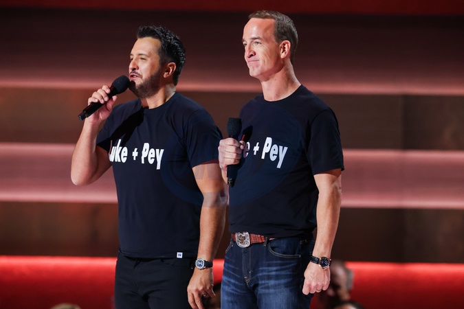 Luke Bryan and Peyton Manning onstage at the 57th Annual Country Music Association Awards held at the Bridgestone Arena on November 8, 2023 in Nashville, TN.© Curtis Hilbun / AFF-USA.COM