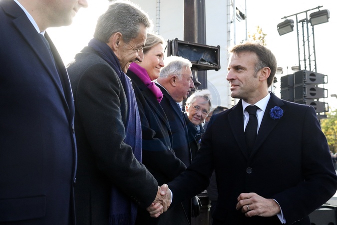 Le président français, Emmanuel Macron et l'ex président Nicolas Sarkozy à la cérémonie de dépôt de gerbe et du ravivage de la flamme de la Tombe du Soldat inconnu à l'Arc de Triomphe lors de la cérémonie du 105ème anniversaire de l'Armistice de 1918, mettant fin à la Première Guerre mondiale, à Paris, France, le 11 novembre 2023. © Stéphane Lemouton/Bestimage French President takes part at the wreath-laying ceremony and rekindling of the flame of the Tomb of the Unknown Soldier at the Arc de Triomphe during the ceremony of the 105th anniversary of the Armistice of 1918, ending World War I, in Paris, France, on November 11, 2023.