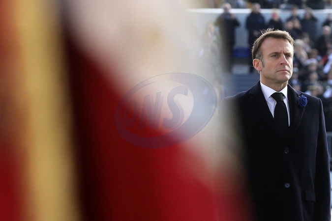 Le président Emmanuel Macron participe à la cérémonie de dépôt de gerbe et du ravivage de la flamme de la Tombe du Soldat inconnu à l'Arc de Triomphe lors de la cérémonie du 105ème anniversaire de l'Armistice de 1918
