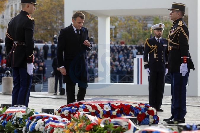 Le président Emmanuel Macron participe à la cérémonie de dépôt de gerbe et du ravivage de la flamme de la Tombe du Soldat inconnu à l'Arc de Triomphe lors de la cérémonie du 105ème anniversaire de l'Armistice de 1918