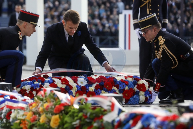 Le président Emmanuel Macron participe à la cérémonie de dépôt de gerbe et du ravivage de la flamme de la Tombe du Soldat inconnu à l'Arc de Triomphe lors de la cérémonie du 105ème anniversaire de l'Armistice de 1918