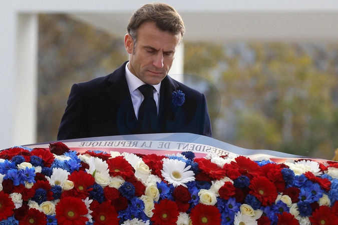 Le président Emmanuel Macron participe à la cérémonie de dépôt de gerbe et du ravivage de la flamme de la Tombe du Soldat inconnu à l'Arc de Triomphe lors de la cérémonie du 105ème anniversaire de l'Armistice de 1918