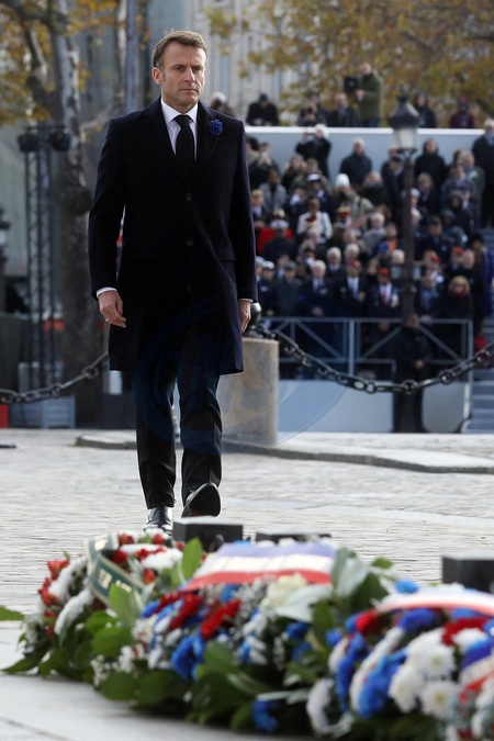 Le président Emmanuel Macron participe à la cérémonie de dépôt de gerbe et du ravivage de la flamme de la Tombe du Soldat inconnu à l'Arc de Triomphe lors de la cérémonie du 105ème anniversaire de l'Armistice de 1918