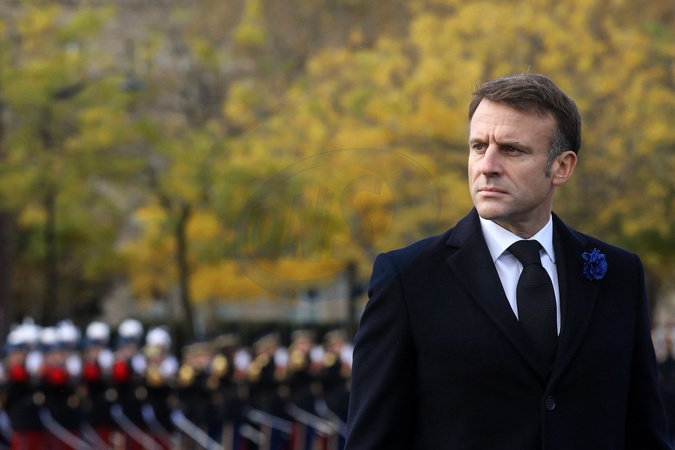 Le président Emmanuel Macron participe à la cérémonie de dépôt de gerbe et du ravivage de la flamme de la Tombe du Soldat inconnu à l'Arc de Triomphe lors de la cérémonie du 105ème anniversaire de l'Armistice de 1918
