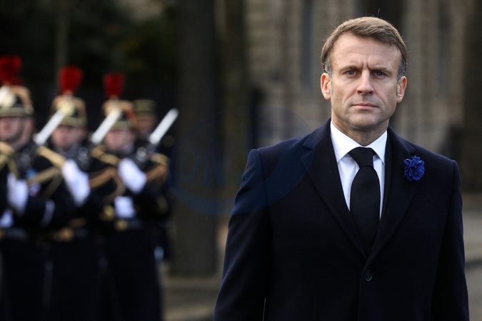 Le président Emmanuel Macron participe à la cérémonie de dépôt de gerbe et du ravivage de la flamme de la Tombe du Soldat inconnu à l'Arc de Triomphe lors de la cérémonie du 105ème anniversaire de l'Armistice de 1918