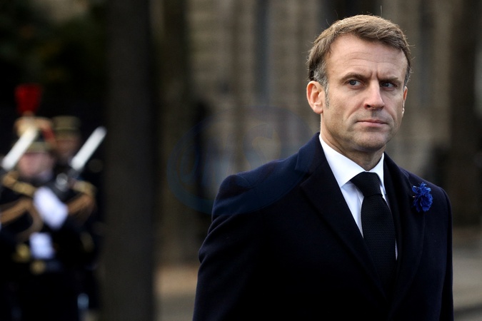 Le président Emmanuel Macron participe à la cérémonie de dépôt de gerbe et du ravivage de la flamme de la Tombe du Soldat inconnu à l'Arc de Triomphe lors de la cérémonie du 105ème anniversaire de l'Armistice de 1918