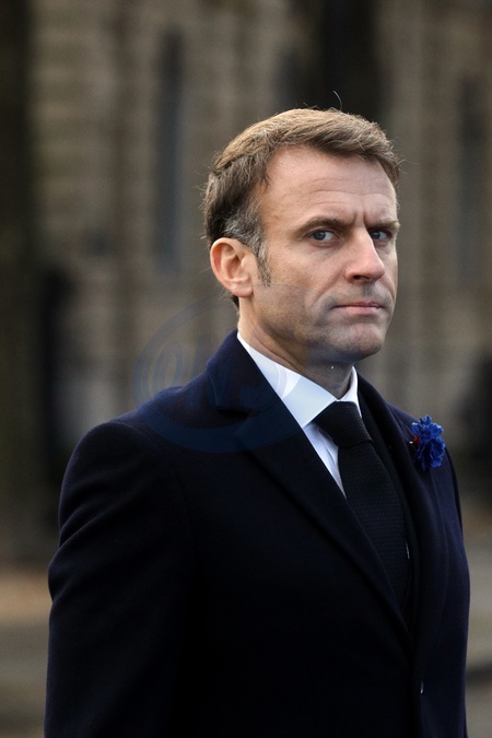 Le président Emmanuel Macron participe à la cérémonie de dépôt de gerbe et du ravivage de la flamme de la Tombe du Soldat inconnu à l'Arc de Triomphe lors de la cérémonie du 105ème anniversaire de l'Armistice de 1918