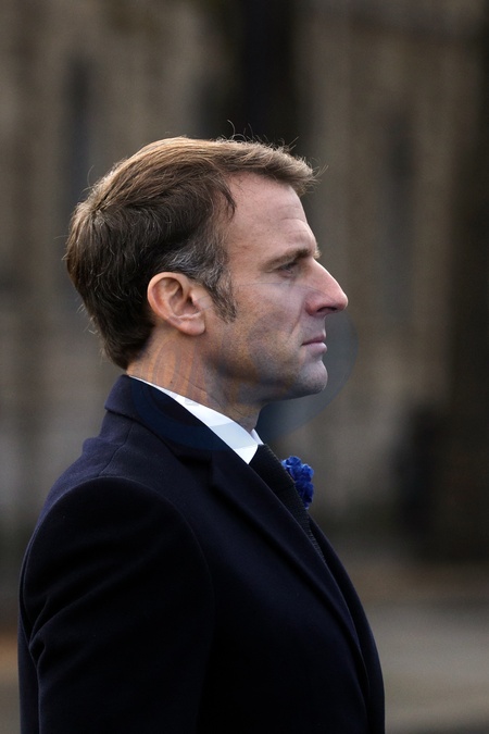 Le président Emmanuel Macron participe à la cérémonie de dépôt de gerbe et du ravivage de la flamme de la Tombe du Soldat inconnu à l'Arc de Triomphe lors de la cérémonie du 105ème anniversaire de l'Armistice de 1918