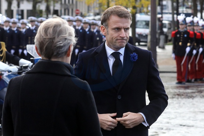Le président français, Emmanuel Macron et la première ministre Elisabeth Borne à la cérémonie de dépôt de gerbe et du ravivage de la flamme de la Tombe du Soldat inconnu à l'Arc de Triomphe lors de la cérémonie du 105ème anniversaire de l'Armistice de 1918, mettant fin à la Première Guerre mondiale, à Paris, France, le 11 novembre 2023. © Stéphane Lemouton/Bestimage French President takes part at the wreath-laying ceremony and rekindling of the flame of the Tomb of the Unknown Soldier at the Arc de Triomphe during the ceremony of the 105th anniversary of the Armistice of 1918, ending World War I, in Paris, France, on November 11, 2023.