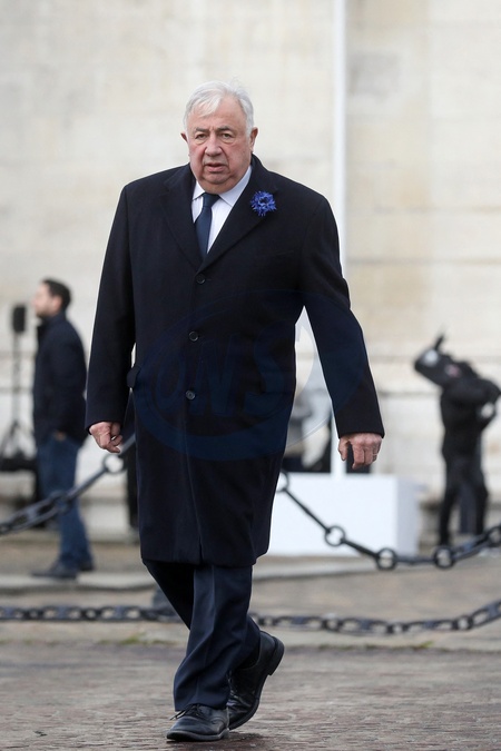 Gérard Larcher, président du Sénat à la cérémonie de dépôt de gerbe et du ravivage de la flamme de la Tombe du Soldat inconnu à l'Arc de Triomphe lors de la cérémonie du 105ème anniversaire de l'Armistice de 1918, mettant fin à la Première Guerre mondiale, à Paris, France, le 11 novembre 2023. © Stéphane Lemouton/Bestimage French President takes part at the wreath-laying ceremony and rekindling of the flame of the Tomb of the Unknown Soldier at the Arc de Triomphe during the ceremony of the 105th anniversary of the Armistice of 1918, ending World War I, in Paris, France, on November 11, 2023.