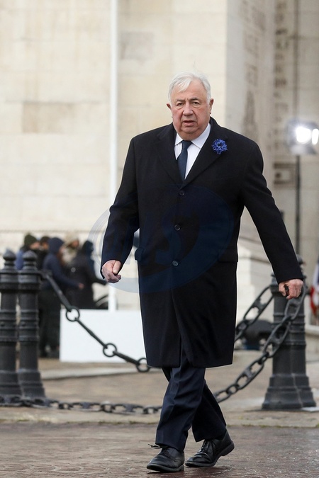 Gérard Larcher, président du Sénat à la cérémonie de dépôt de gerbe et du ravivage de la flamme de la Tombe du Soldat inconnu à l'Arc de Triomphe lors de la cérémonie du 105ème anniversaire de l'Armistice de 1918, mettant fin à la Première Guerre mondiale, à Paris, France, le 11 novembre 2023. © Stéphane Lemouton/Bestimage French President takes part at the wreath-laying ceremony and rekindling of the flame of the Tomb of the Unknown Soldier at the Arc de Triomphe during the ceremony of the 105th anniversary of the Armistice of 1918, ending World War I, in Paris, France, on November 11, 2023.