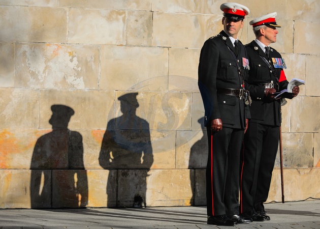London, UK 11th Nov 2023. Officers cast a silhouette shadow at St Paul's. Troups, military and civil participants as the parade passes St Paul's Cathedral. This year's Lord Mayor's Show brings together 7,000 people, including charities, community groups, the armed forces, 250 horses, and over 150 floats in a three-mile-long parade, including the golden State Coach with new Lord Mayor Michael Mainelli., Credit:Imageplotter / Avalon