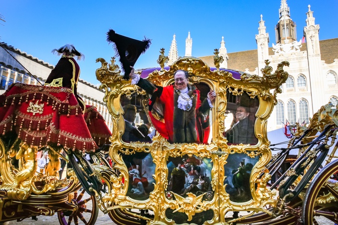London, UK 11th Nov 2023. The new Lord Mayor Michael Mainelli, at Guildhall Yard in the Lord Mayor's golden State Coach, which has been used in every Show since 1757. This year's Lord Mayor's Show brings together 7,000 people, including charities, community groups, the armed forces, 250 horses, and over 150 floats in a three-mile-long parade, including the golden State Coach with new Lord Mayor Michael Mainelli., Credit:Imageplotter / Avalon