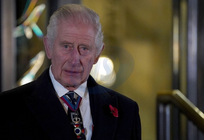Britain's King Charles reacts after unveiling statues of Britain's Queen Elizabeth and Prince Phillip upon his and Queen Camilla arrival to attend the Royal British Legion Festival of Remembrance at the Royal Albert Hall in London, Britain, November 11, 2023., Credit:MAJA SMIEJKOWSKA / Avalon