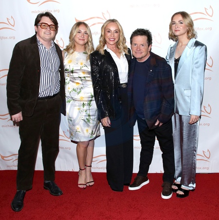 Sam Fox, Aquinnah Fox, Tracy Pollan, Michael J. Fox and Schuyler Fox attending the Michael J. Fox Foundation 2023 'A Funny Thing Happened on the Way to Cure Parkinson's' Gala held at Cipriani South Street at Casa Cipriani on November 11, 2023 in New York City, NY©Steven Bergman/AFF-USA.COM