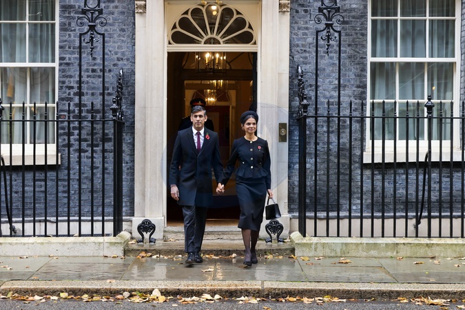 12/11/2023. London, United Kingdom. The Prime Minister, Rishi Sunak leaves No10 Downing Street with his wife, Akshata Murty for the Remembrance Sunday parade at The Cenotaph., Credit:Rory Arnold / Avalon