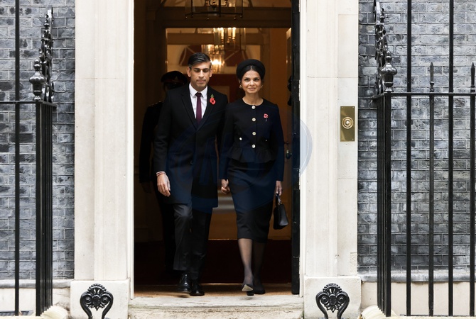 12/11/2023. London, United Kingdom. The Prime Minister, Rishi Sunak leaves No10 Downing Street with his wife, Akshata Murty for the Remembrance Sunday parade at The Cenotaph., Credit:Rory Arnold / Avalon